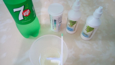 7upです。色が変わって50ppmありましたので使えます、味はカルキの炭酸入りみたいな感じで微妙ですがなんとか飲めます(3滴と3滴)