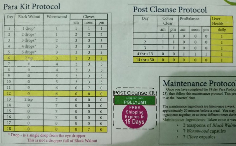 Parasite Cleanse と Dr. Hulda Clark の言葉で検索をすれば、詳しい飲み方がネット上でたくさん見つかりますので、興味があれば検索してみて下さい。寄生虫の成長サイクルと段階が関係する為、飲み方と容量が決まっています。